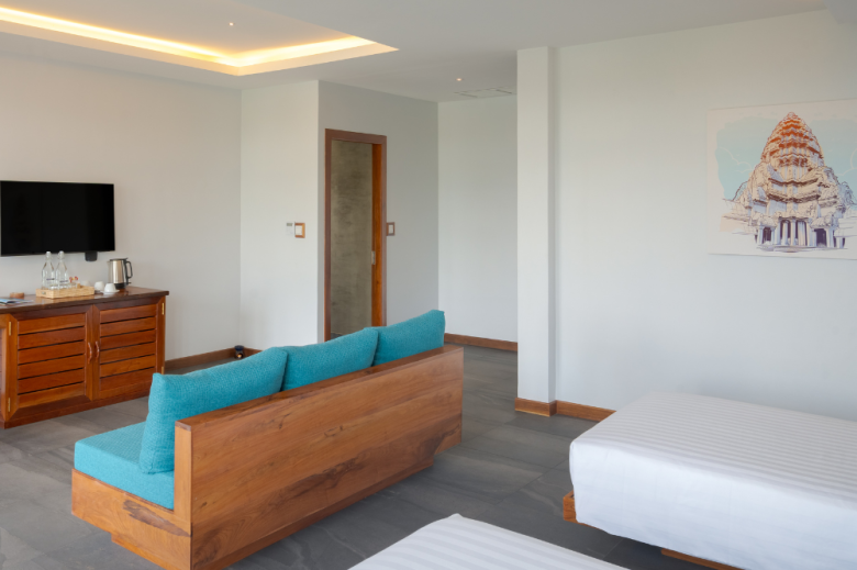 Guests will enjoy a special experience in a Khmer-style double room with a pool and a view. The spacious double room offers air conditioning, a private entrance, a terrace with garden views, and a private bathroom with a bathtub. There are 11 rooms in total, each measuring 30 square meters, on the first and second floors.